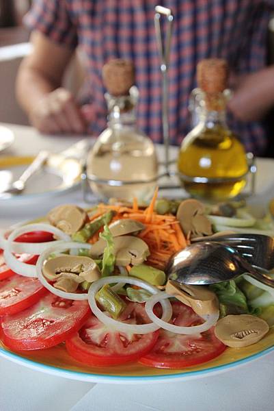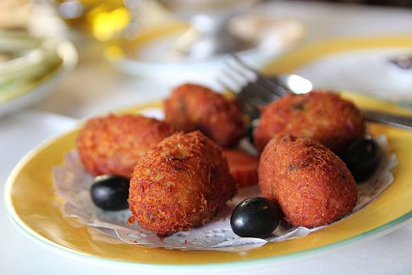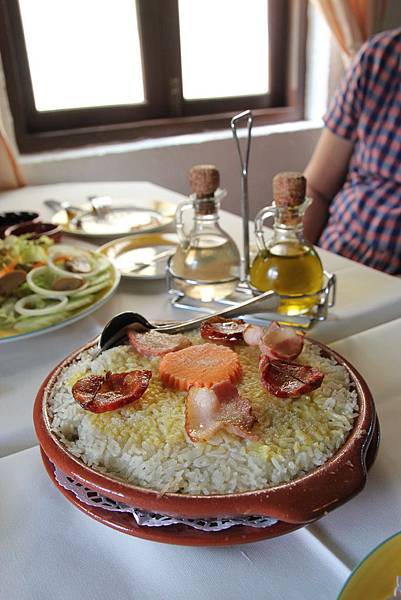 手氣正好,品涵頗有撩落去的態勢,還好我很冷靜,算了一下大概賺到免費午餐了,便把她拉走去路環吃飯。對了,賭場內不能拍照,所以我們把籌碼拿出來拍照後再去換錢。路環這家葡國餐廳叫里斯本地帶,不便宜,但好吃。為我媽點的沙拉超大盤,炸的這個丸子好像是馬鈴薯,唉呀,這就是沒有馬上寫的缺點,時間過太久,都忘了。另外有飯的這一盤裡面有鴨肉,很香哦,是葡國的傳統料理。我們只點這三道,再加上免費的麵包,很撐了,況且,我們還有一樣來路環一定要吃的東西。