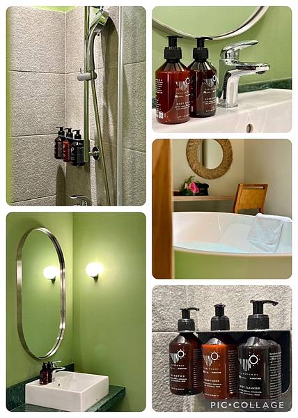 衛浴空間的牆面是綠色的,視覺感受上很抒壓,加上丘丘森旅選用的是沒有經動物實驗的沐浴品牌ABOVTIME,舒服的柑橘與木質調氣味,讓洗澡成了極大的享受。洗手檯的桌面與客廳的小桌子用的都是花蓮在地的蛇紋石,增添了一點低調的奢華感。