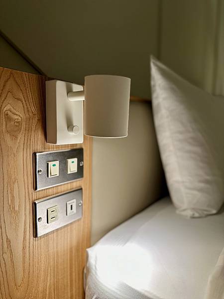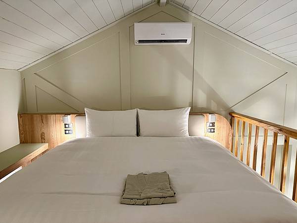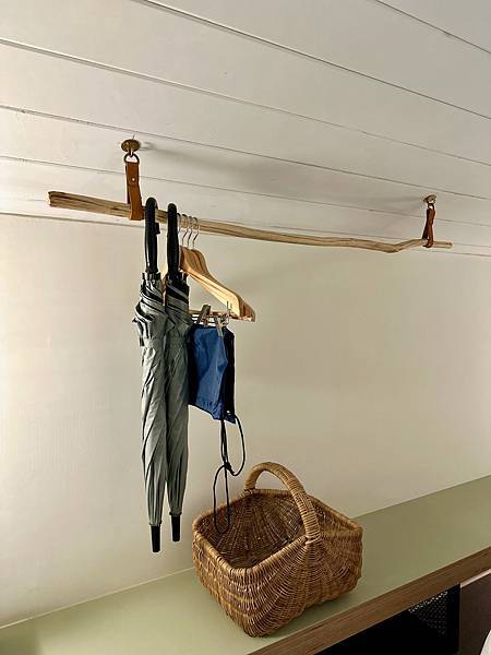 閣樓純粹就是睡覺的地方,一般印象中的「閣樓」空間都很小,但「谷嶼」的閣樓高度還滿高的,完全可以站立行走。沒有衣櫥,但有一個開放式的衣架,有雨傘、掛衣服的衣架,下面還有一個像野餐籃的籃子。丘丘森旅的綠地非常多,興致好的話確實可以在這野餐。